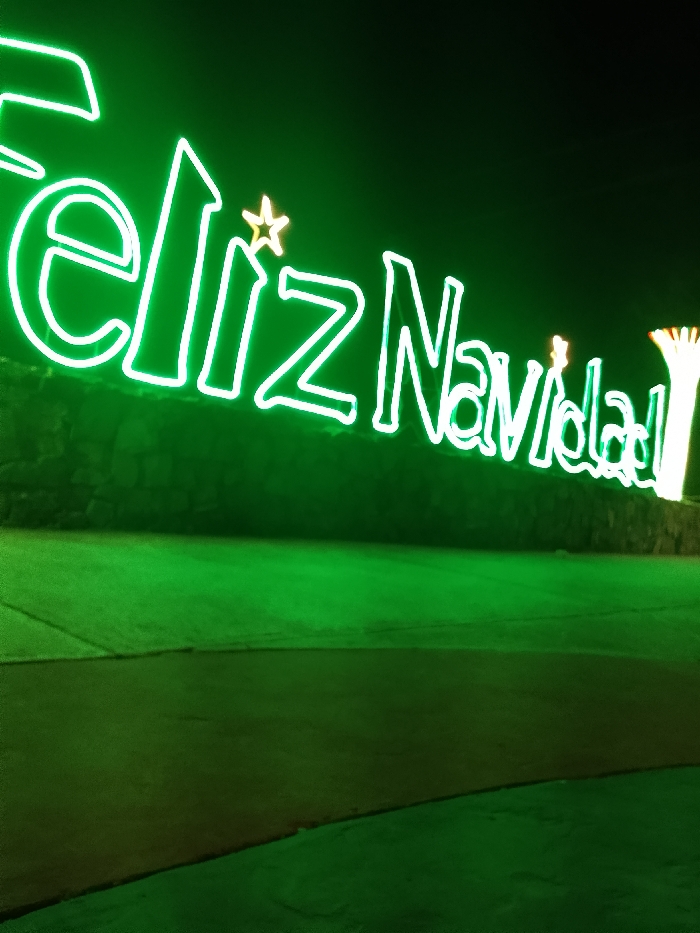 A bright green neon sign reading "Feliz Navidad" is perched on a low stone wall