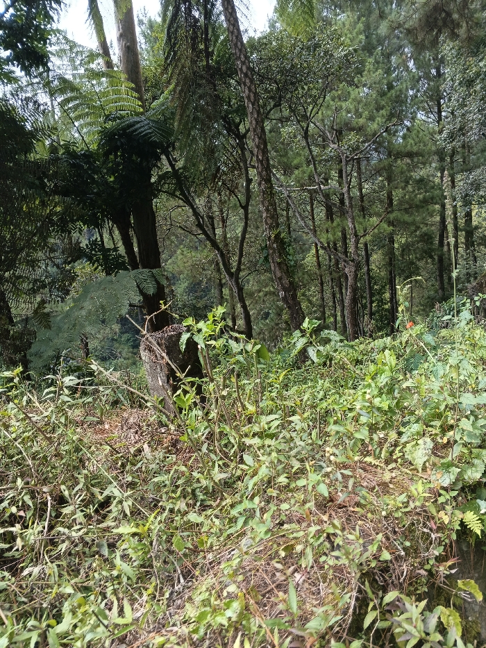 A static outdoor scene depicts a dense forest environment, located in Buyantashi, Zambia. The foreground is characterized by thick, unkempt green undergrowth, primarily consisting of various leafy plants and scattered dry foliage that largely obscures the ground. In the midground, a dark, weathered tree stump is partially visible on the left side, surrounded by additional dense vegetation including a large fern with prominent fronds. The background features a thick forest canopy composed of numerous tall, slender tree trunks, some appearing to be conifers, forming a dense green wall of foliage that extends upwards. Minimal sky is faintly visible at the top edge. No individuals, animals, or artificial objects are present. No actions or interactions are depicted within the scene. The lighting is diffused and natural.