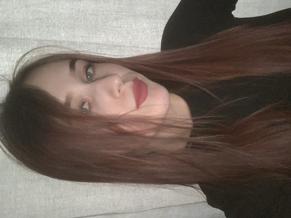 The image displays a close-up portrait of a single female individual, likely captured indoors. The subject has long, straight, reddish-brown hair and light-colored eyes. She is wearing dark red lipstick and a black, high-necked garment. Her head is slightly tilted, and she is looking directly at the camera. The background consists of a uniformly lit, light-colored, textured surface, consistent with a curtain or wallpaper. The exact location within the city of Фоки, Russia, is not discernible from the visual information provided in the image.