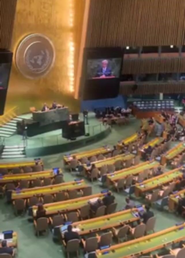 n assembly hall filled with people. The United Nations logo is visible on the wall. There is a screen showing a man speaking. The hall has rows of desks and chairs. People are seated at the desks. There is a raised platform at the front of the hall with people sitting and standing.