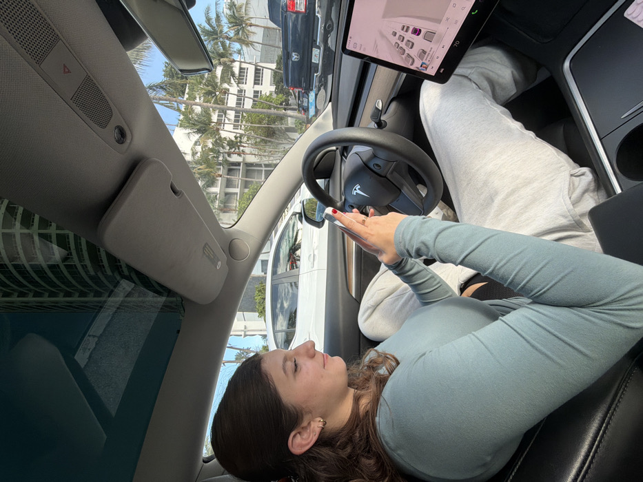 A young adult female is seated in the driver's seat of a Tesla vehicle, stopped in traffic on a sunny day in Miami Beach, United States of America