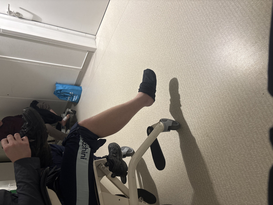 An individual is seated on a leg press machine, clad in dark shorts adorned with a white stripe and the word "beschini". Their left leg is extended, foot adorned with a black sock. The leg press machine, partially visible, features a white frame with black and gray accents. The background is a light-colored wall. A blue bag is visible in the upper left corner.
