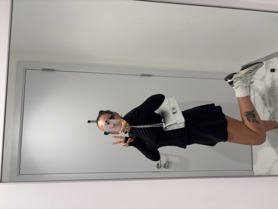 A person is depicted in a full-length mirror selfie within an indoor setting, likely a changing room, in Dubai, United Arab Emirates. The individual, dressed in a black long-sleeved top with a high collar and a black skirt, is holding a silver metallic handbag with a chain strap and a prominent logo clasp, possibly Chanel. They are wearing white socks and silver and black athletic shoes. A tattoo is visible on the lower right leg. The person's right hand holds a pink smartphone, with fingers forming a "peace" sign, obscuring the face, which is also partially covered by black sunglasses. Hair is pulled back in a bun. The background features a plain white door with a silver handle to the viewer's left, and white walls. The floor is composed of light-colored tiles, and a small black cylindrical object lies on the floor near the right foot.