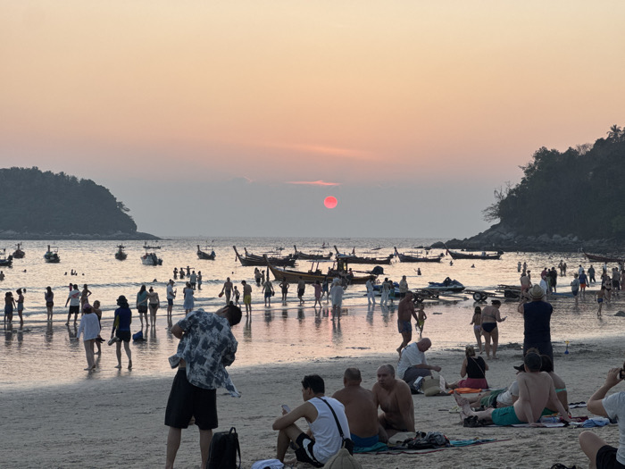 The image displays Karon Beach in Karon, Thailand, during sunset. A prominent red sun is visible on the horizon, illuminating the sky with gradients of orange and pink and reflecting on the wet sand of the shoreline. The scene is densely populated by numerous individuals distributed across the beach and wading in the shallow bay waters. In the background, two dark, tree-covered landmasses frame the bay. The water accommodates multiple traditional longtail boats and smaller motorboats, either anchored or beached. A jet ski rests on the sand near the waterline. People are engaged in various activities: many are standing or wading in the water, several individuals are seated on the sand, some utilizing towels, and a few are actively observing or photographing the sunset, one with a camera raised to their eye. Attire primarily consists of beachwear, including swimsuits, shorts, and light shirts. In the mid-foreground, an individual in a patterned shirt and dark shorts stands with their back partially turned, appearing to adjust their clothing or orient towards the water.