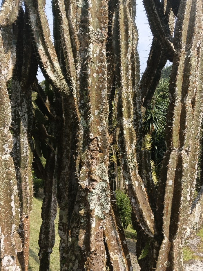 The scene is located in Baglung, Nepal. It depicts a dense cluster of multiple tall, vertical columnar cactus stems, which occupy the majority of the frame. The robust stems are mottled dark green and brown, heavily encrusted with extensive white and light green lichen patches. Each stem features prominent vertical ridges along which numerous small, sharp, light-colored spines project. Through the irregular gaps between the stems, glimpses of the background reveal brighter green foliage, indicative of other plants or trees, and sections of a pale blue sky. The lighting suggests a bright, outdoor, daytime setting. No individuals or specific man-made objects are visible within the depicted area.