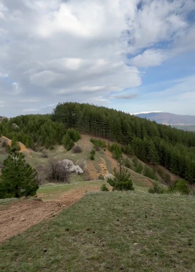 landscape of rolling hills and a valley from a slightly elevated position. The foreground is dominated by grassy patches and dirt trails. A hillside covered with coniferous trees is visible, with patches of sparse grass and a few flowering trees scattered throughout. Further in the background is a valley with a distant mountain range with snow-capped peaks. The sky is partly cloudy with patches of blue sky visible. In the final moment, the dashboard of a vehicle is revealed, showing a partial view of the speedometer and an "aprilia racing" sticker.