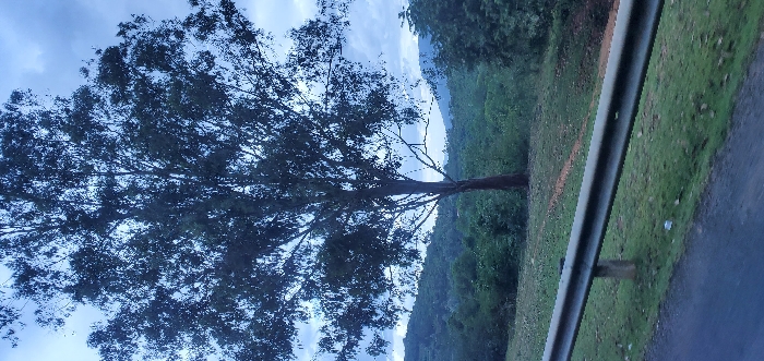 A roadside view features a tree, a guardrail, and forested hills in the background. The tree is silhouetted against a cloudy sky. Lush greenery covers the hillside. The guardrail runs along the road edge. The scene is slightly rotated, with the road appearing on the lower right.