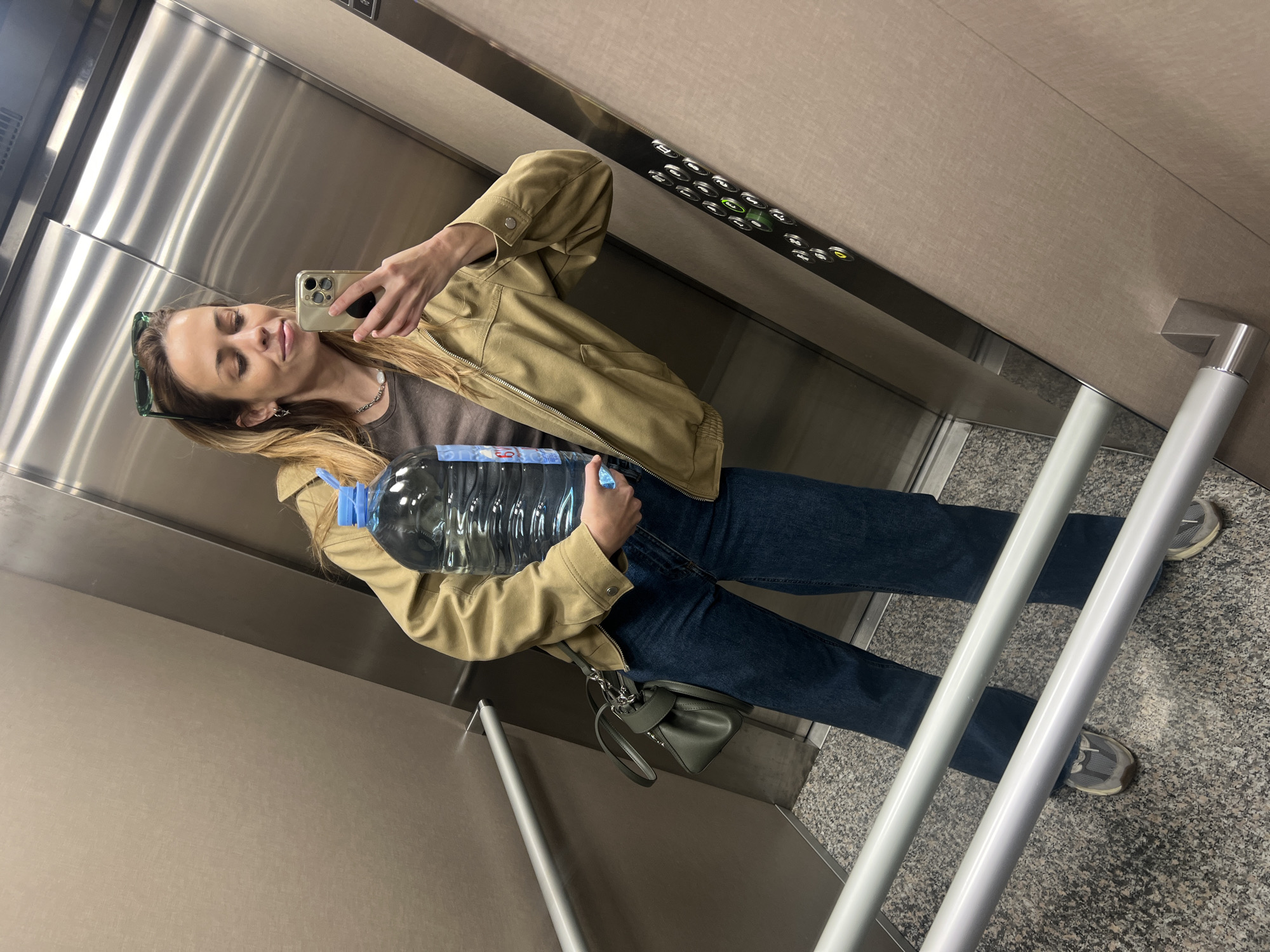 The scene depicts the interior of an elevator located in Bjeliši, Montenegro. A single female subject is positioned centrally, taking a mirror selfie with a smartphone held in her right hand. She has light-colored hair, pushed-up green sunglasses, and is wearing a dark t-shirt, a beige bomber jacket, dark blue jeans, and grey athletic shoes. In her left arm, she holds a large, transparent plastic water bottle with a blue cap, estimated to be a 5-gallon size. A dark green crossbody bag is slung over her left shoulder. The elevator features light beige textured wall panels, a vertical brushed metal strip on the right side, and brushed metal doors. A control panel with illuminated green and yellow buttons is visible on the right wall. The floor is a speckled grey terrazzo or granite, and two silver-colored metal handrails are present at the bottom of the frame, partially visible and reflected on the floor.