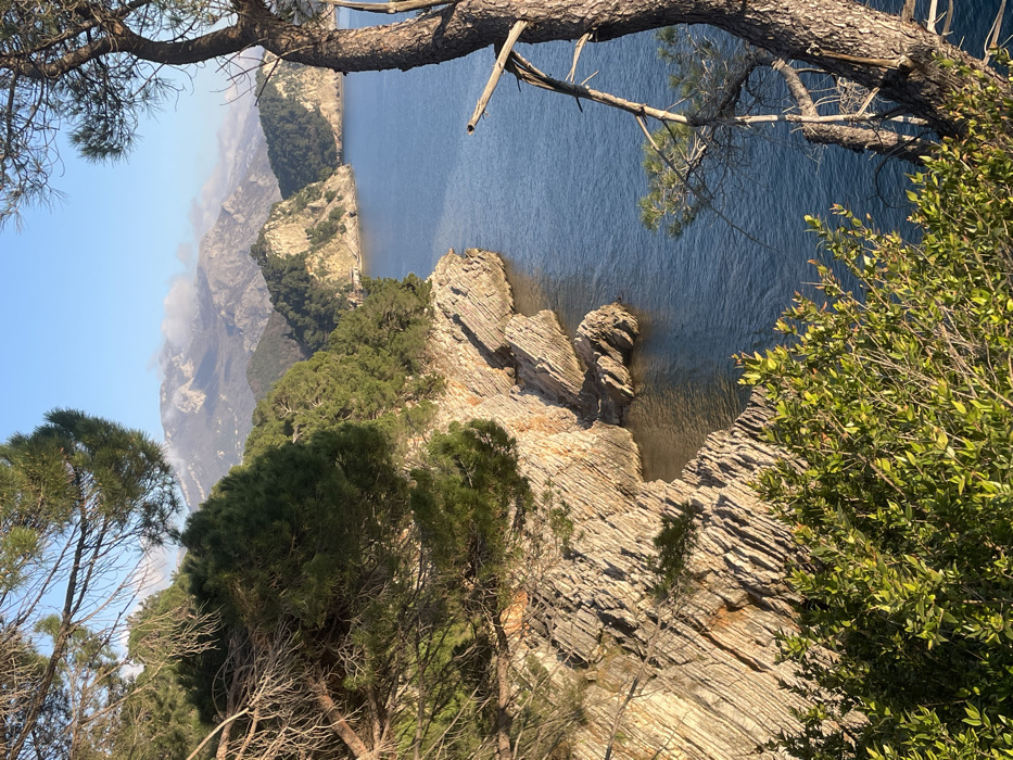 This image depicts a sunlit coastal scene in Mirište, Montenegro. The foreground is dominated by vibrant green foliage and the dark, textured trunks and branches of pine trees framing the view from the left and right sides. Below, a rugged, layered rock cliff face, characterized by distinct horizontal strata of light grey and tan rock, descends steeply into the calm, deep blue water. The top edge of the cliff is densely vegetated with evergreen trees. The midground reveals an expansive view of the Adriatic Sea, with additional forested coastal hills and small peninsulas extending into the water, forming inlets and coves. In the background, large, hazy grey mountains rise, their upper sections partially obscured by scattered white clouds under a clear, light blue sky. The scene is illuminated by natural sunlight, suggesting either early morning or late afternoon, with bright highlights on the water and cliff faces, and some areas in shadow. No human figures, man-made structures, or activities are present in the image.