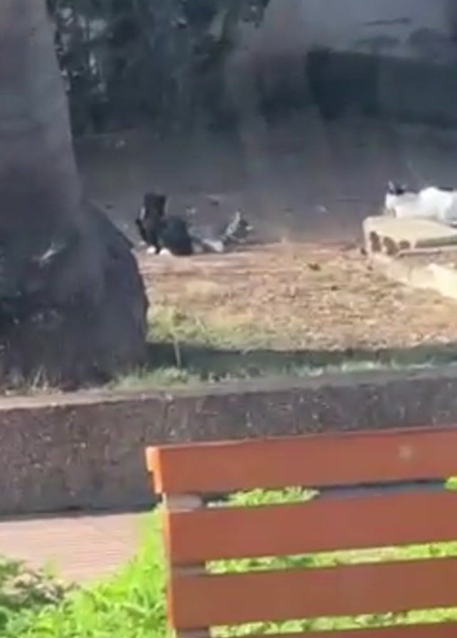The camera captures a low-angle shot from behind a wooden park bench, providing a view of a small park area. In the background, three cats are visible. To the left, near a large tree trunk, a black and white cat sits upright, while a gray cat lies prone on the ground. Further to the right, a white cat rests on a concrete structure. The park area consists of patchy grass and mulch, enclosed by low concrete borders.