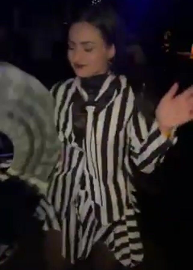 crowd of people dancing in a nightclub with blue and green lighting. A woman in a black and white striped shirt dances while holding a fan made of money. A man in a white shirt and fedora walks through the crowd.