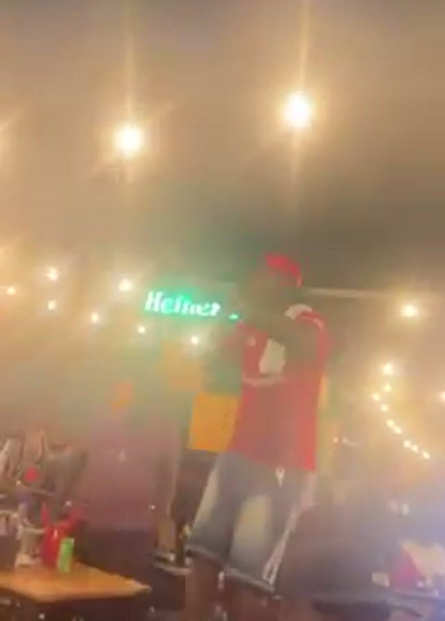 man standing on top of what appears to be a bar table at an indoor restaurant. The man is wearing a red shirt, denim shorts, white sneakers, and a red hat. He seems to be dancing or gesturing with a white cloth or towel in his hand. Several people are seated at tables around him. Behind him is a green and yellow checkered wall with a bright neon Heineken sign on it, and strings of decorative lights hang from the ceiling. The lighting is generally bright, with several individual overhead lights illuminating the scene. One man, wearing a black baseball cap, is sitting in the foreground of the shot, looking towards the man on the table.