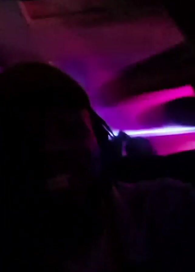 person in the dark, illuminated by changing colored lights. The individual, possibly wearing a hat, is largely in shadow, making specific details difficult to discern. Music plays in the background. The lighting shifts between blue, green, and pink.
