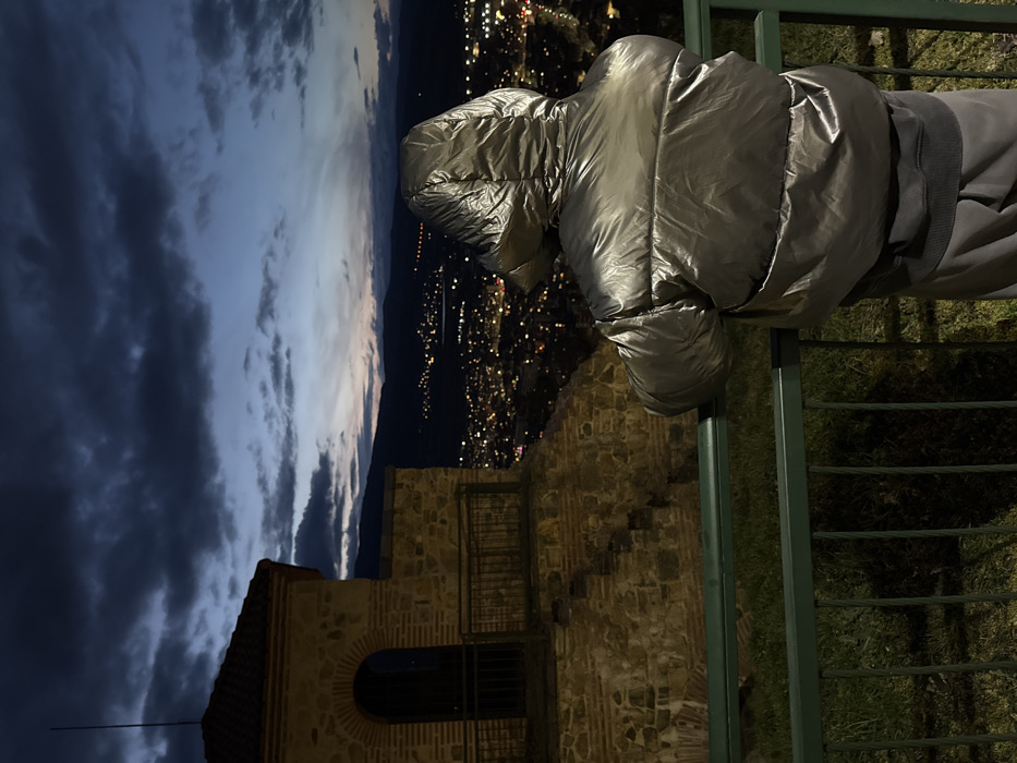 The image captures an elevated nighttime scene overlooking the city of Kyustendil, Bulgaria, consistent with a vantage point from Hisarlaka Fortress. In the foreground, a person is observed from behind, dressed in a shiny, dark grey or silver hooded puffer jacket worn over a dark grey sweatshirt and matching pants. The individual leans on a dark green metal railing, facing away from the viewer and towards the city lights below. To the left, a section of a stone and reddish-brown brick structure, potentially part of the fortress wall or a tower, is visible. This structure features an arched window opening and a tiled roof, with a dark metal railing on an elevated platform or balcony. The structure is illuminated by artificial light. Beyond the railing and the immediate architectural element, the city of Kyustendil extends into the middle ground, illuminated by numerous scattered golden and white artificial lights. In the background, dark mountain ranges are silhouetted against a twilight sky, which displays hues of deep blue near the horizon transitioning to darker clouds overhead.