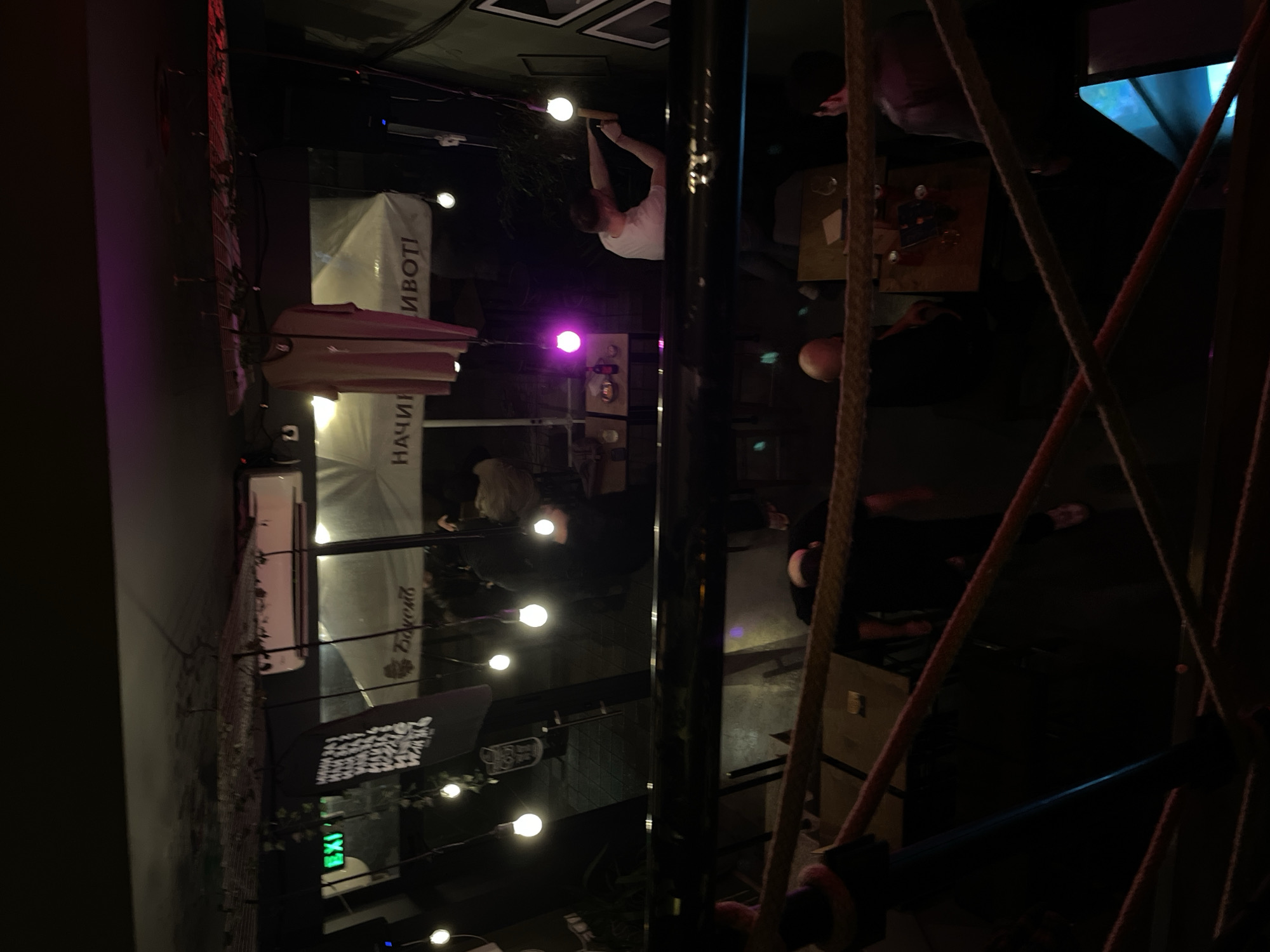This image captures an elevated perspective of an indoor/outdoor establishment in Pazardzhik, Bulgaria, during evening hours, characterized by dim ambient lighting. In the foreground, a multi-layered rope barrier, consistent with a railing or decorative element, partially obstructs the view of the lower area. The mid-ground reveals several individuals and tables. A bald individual is seated with their back to the camera. Another person in a dark shirt is visible from behind. The background encompasses the main activity area and a covered outdoor section. On the right, a male individual wearing a white short-sleeved t-shirt is engaged in hanging or adjusting a light-colored, rectangular object on a dark green wall, illuminated by a magenta spotlight. A small table behind him holds a red bottle and glassware. Further back, under a large, light-colored canopy, Bulgarian text is legible: "НАЧИН НА ЖИВОТ" ("WAY OF LIFE") and "БОХЕМИ" ("BOHEMIANS"). A white wall-mounted air conditioning unit is visible. String lights with bare bulbs hang throughout the space, providing illumination. A green "EXIT" sign is mounted on the left wall. A dark banner with white text and a plain light-colored garment (possibly a T-shirt) hang from overhead structures. Several indistinct figures are present under the canopy, including one with light hair. A blue light source is visible in the lower right background.