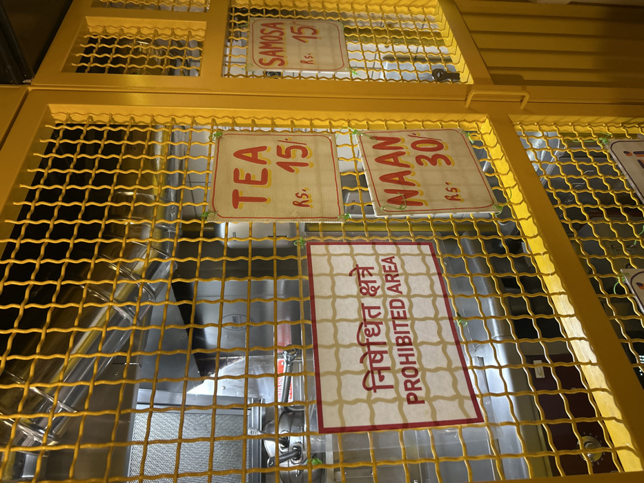 A bright yellow metal mesh partition dominates the foreground of an interior scene, separating the viewer from a functional area. Behind the mesh, industrial-style kitchen equipment is visible, including stainless steel surfaces and transparent cylindrical tubes, likely part of a conveyance or processing system. A blurred figure in a white garment, possibly a worker, is partially discernible behind the machinery in the upper left background. Attached to the yellow mesh are multiple rectangular signs. On the left, a white sign with a red border displays "निषेधित क्षेत्र" in Hindi and "PROHIBITED AREA" in English. To its right and below, smaller, light-colored signs, appearing hand-crafted, list food items and prices: "TEA Rs. 15/-" and "NAAN Rs. 30/-". A third sign, partially visible on the far right, also lists a food item and price: "SAMOSA Rs. 15/-". The currency indicated on all price signs is "Rs.", and Hindi script is present on the prohibition sign. The environment suggests a commercial food establishment or a processing area within one.