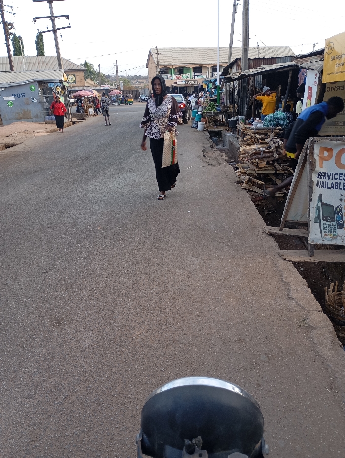A woman walks down an empty street in a modest urban area. She wears a patterned top, black pants, and carries a bag. Along the right are open-air shops and piles of wood. A sign advertises phone services. Other people are visible in the background, along with buildings and overhead power lines. The photo is taken from a low angle, as if from a vehicle or motorbike.