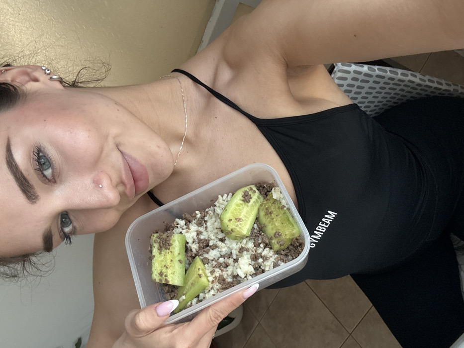 This image depicts a female subject indoors in Sofia, Bulgaria. The subject, an adult, is captured from the chest up, looking directly at the camera with a slight smile. She has blue eyes, light brown eyebrows, a stud piercing in her left nostril, and multiple piercings in her left ear. She is wearing a black spaghetti strap top with "GYMBEAM" printed in white on the chest, and black leggings are partially visible. A thin silver-colored necklace adorns her neck. Her right hand, featuring manicured nails with a French tip design, holds a clear plastic rectangular food container towards the viewer. The container holds a meal consisting of a white rice-like substance, brown granular ground meat, and four large pieces of green cucumber, some with visible seeds. The background is softly blurred, revealing a light orange wall behind the subject, with a partial white door or window frame on the left. A section of a white chair with a grey geometric pattern is visible to the subject's right, and light brown tiled flooring is visible in the lower left portion of the frame.