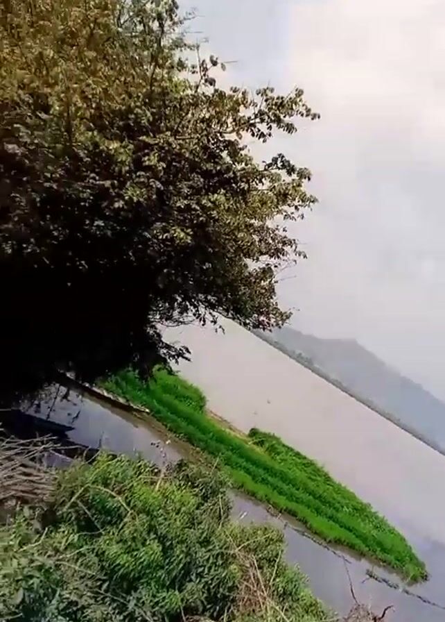 view of a wide body of water, likely a lake or reservoir, with a green island in the foreground. There is a mountain range visible in the distance under a cloudy sky. The camera pans across the scene, revealing a thick layer of vegetation, including trees and bushes, along the bank. The ground near the vegetation appears to be dirt and some sparse debris.