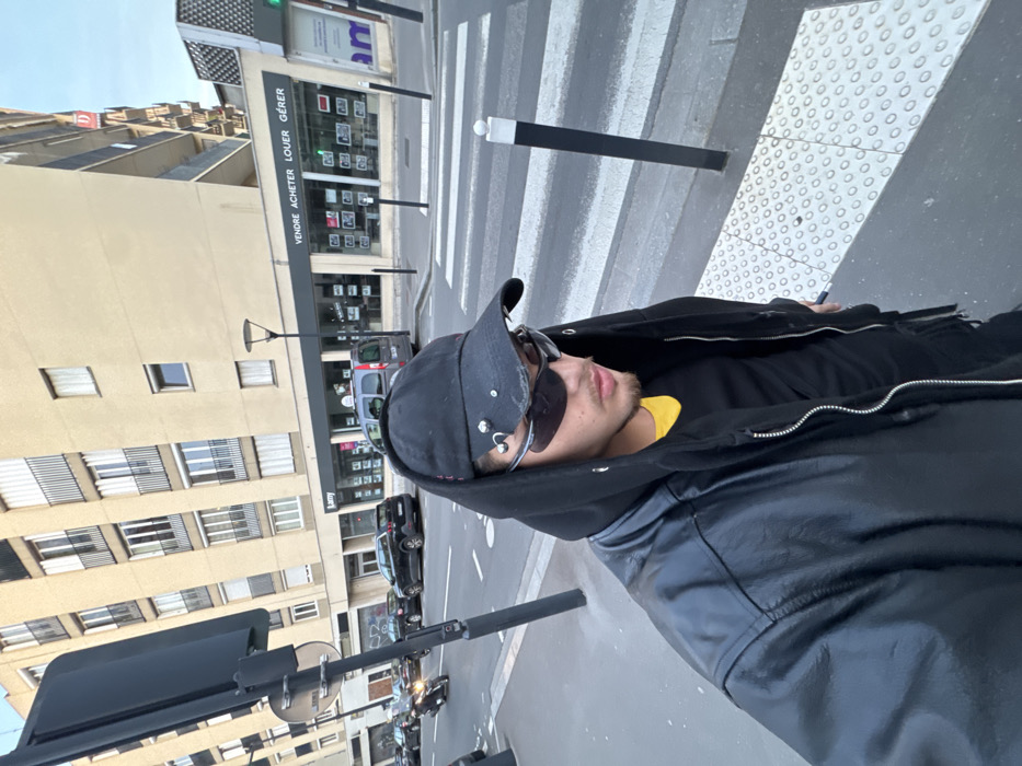 The image displays an urban street scene in Bois-Colombes, France, captured from a low perspective. In the immediate foreground, positioned to the lower right, is a male individual with light skin and facial stubble. He is attired in a black baseball cap featuring metallic studs and rings, dark wraparound sunglasses, a black hooded jacket with the hood raised, a black t-shirt, and an open black leather-like jacket over the hoody. A yellow garment collar is visible beneath the black t-shirt. The individual is looking slightly downwards and to the left. He stands on a section of sidewalk with tactile paving, distinguished by raised white circular patterns. Adjacent to the individual on the left is a dark grey pole, likely a street sign support, with a circular sign affixed. The street itself contains a pedestrian crossing marked with white zebra stripes. On the left side of the street, several cars are parked, and a scooter or motorcycle is in motion, moving away from the camera. A black bollard with a white top delineates the pedestrian crossing on the right side of the street, near a modern black street lamp. The background features a multi-story, light-colored building with multiple windows and balconies, suggesting a residential or mixed-use structure. The ground floor accommodates a commercial establishment identified as a real estate agency by the prominent sign "VENDRE ACHETER LOUER GÉRER" and "lamy" displayed across its windows, which exhibit various property listings. The sky above is clear and light blue, indicating daylight.