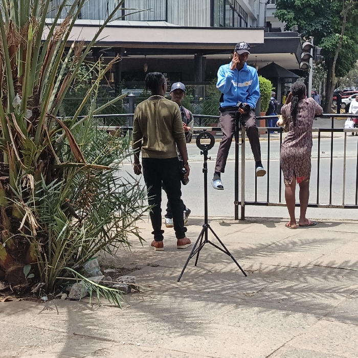 This image depicts an outdoor urban scene on a paved sidewalk in a commercial district of Nairobi, Kenya. In the foreground left, a large, bushy palm-like plant partially obscures the view, with some litter visible at its base. On the sidewalk, from left to right: 1. A male with dreadlocks, wearing an olive-green long-sleeved shirt, black pants, and brown shoes, stands with his back mostly to the viewer, holding a dark object, possibly a camera or phone, in his right hand. 2. Behind and to the right of the first male, a second male wearing a cap and patterned top is partially visible, facing away. 3. A black tripod stand supports a circular LED ring light, positioned on the sidewalk, pointing towards the street. 4. A male wearing a light blue jacket with a white stripe, dark pants, and light-colored slip-on shoes, sits atop a black metal street barrier. He holds a dark camera in his left hand and a mobile phone to his right ear, appearing to be engaged in a call. 5. Further right, a female with braided hair, wearing a striped knee-length dress and red sandals, leans against the same black metal street barrier with her back to the viewer, observing the street. Beyond the barrier, an asphalt road with multiple lanes is visible. A dark traffic light pole with signal heads stands on the far right. In the background, a modern multi-story building with large windows and a dark facade is prominent, suggesting a commercial establishment. Shadows from unseen overhead foliage are cast across the sidewalk, indicating daytime conditions.