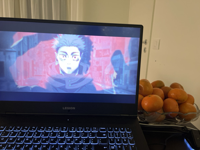 A partially visible black Lenovo Legion laptop displays an anime character on its screen