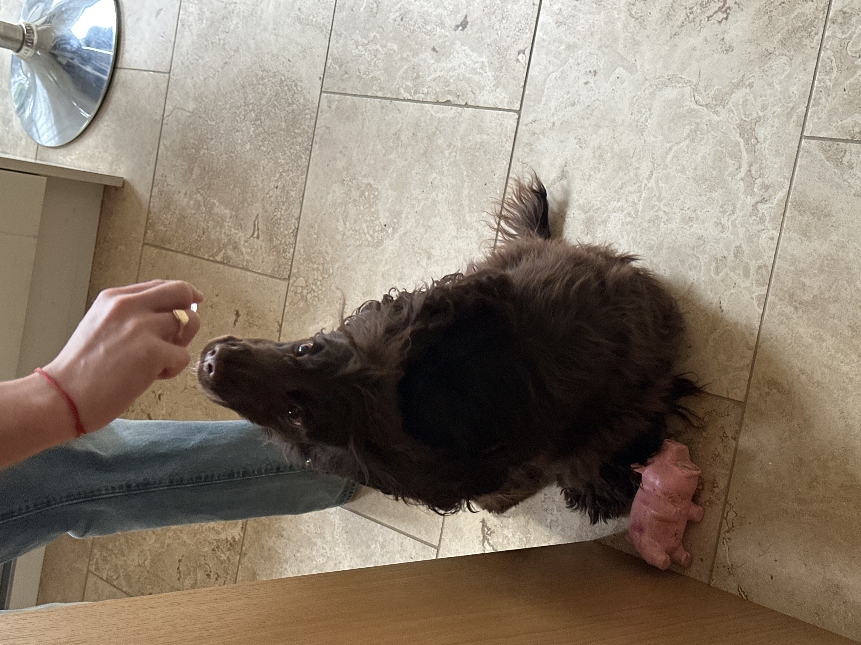 The scene depicts an indoor domestic environment in Tunbridge Wells, United Kingdom. A dark brown, long-haired dog, consistent with a Spaniel type, is seated on a light-toned, square-tiled floor with visible grout lines and a mottled surface. The dog's head is tilted upwards, its gaze fixed on a small, light-colored object held between the thumb and forefinger of a human right hand. This hand is adorned with a red string bracelet and a gold ring on the ring finger. A portion of the human's lower left leg, clad in light blue denim jeans, is visible behind the dog. A pink, pig-shaped dog toy rests on the floor to the dog's left, partially obscured by a light brown wooden vertical panel. In the upper right background, a reflective, circular chrome base of a bar stool is visible on the tiled floor, alongside a light-colored skirting board or cabinet base.
