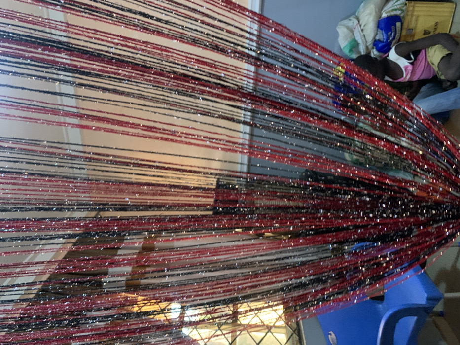 This image depicts an indoor scene in Gura Top, Nigeria, dominated by a foreground string curtain