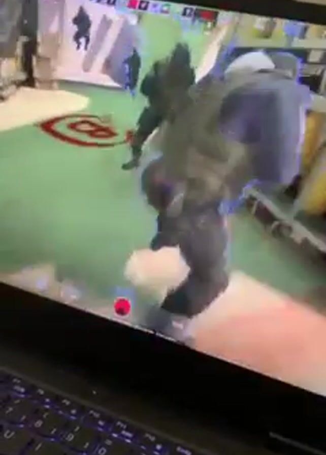 A person is playing a first-person shooter video game on a laptop