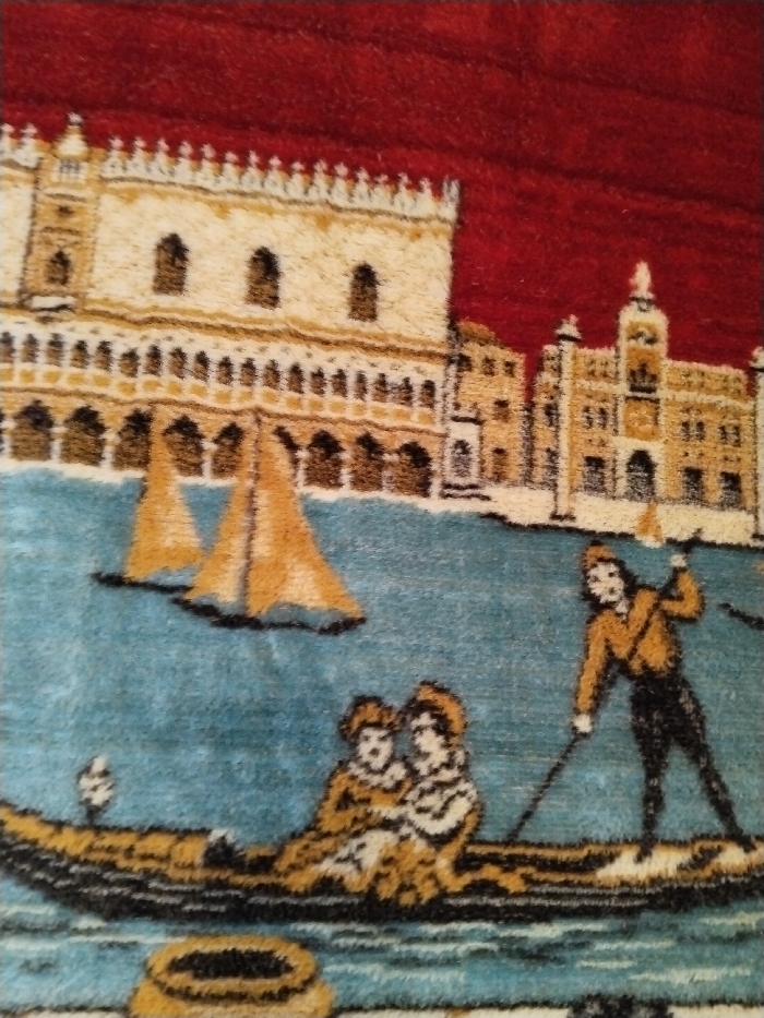 The image displays a close-up section of a woven textile, likely a rug or tapestry, depicting a detailed urban canal scene