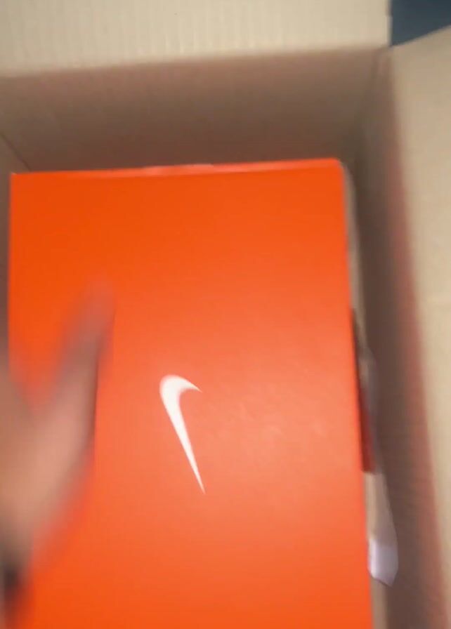 A hand reaches into an open cardboard shipping box marked with a Nike swoosh and pulls out an orange Nike shoebox