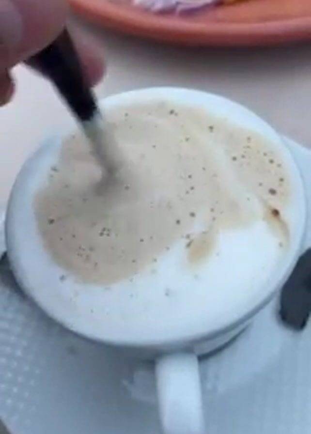 A close-up shot shows a white ceramic cup and saucer of a cappuccino being stirred with a small, black-handled spoon