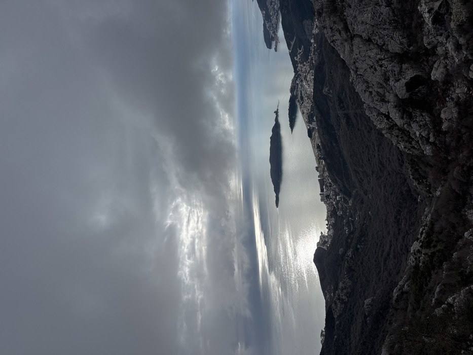 The image depicts a panoramic coastal scene observed from a high vantage point within the city of Vrela, Montenegro. The upper portion of the frame is dominated by a heavily overcast sky with dark grey clouds, though several breaks allow sunlight to penetrate, creating bright, reflective streaks and patches on the water's surface. The central feature is a wide expanse of water, identified as the Adriatic Sea. A prominent, dark, elongated island, Sveti Nikola, is situated in the mid-distance to the left, partially obscuring the water behind it. Along the mainland coastline in the lower midground, a densely developed coastal town, Budva, stretches, characterized by numerous buildings. Further coastal development is visible extending to the right beyond the town. The immediate foreground consists of steep, rugged terrain, with dark, seemingly dormant or evergreen vegetation covering slopes on the left and center, transitioning to lighter-colored, fractured rocky outcrops on the right side of the frame. No human subjects, identifiable actions, or interactions are visible.