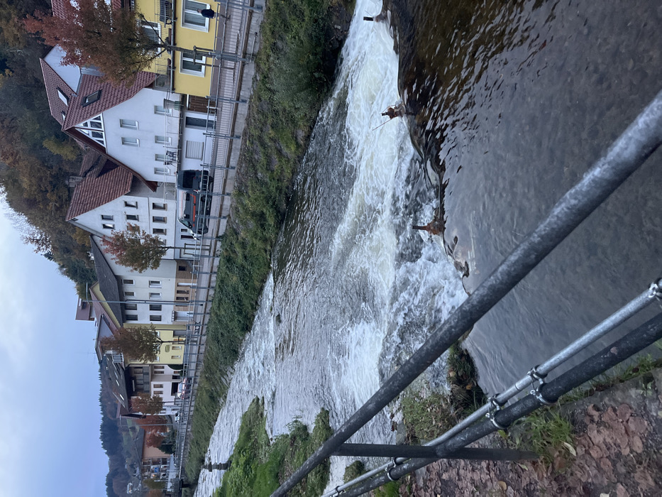 The image displays a detailed view of a section of the Rench river flowing through a residential area in Oppenau, Germany, under an overcast sky. In the immediate foreground, a weathered dark gray metal railing runs diagonally across the lower left quadrant, partially obscuring a muddy bank with scattered brown autumn leaves. The river occupies the central and mid-ground, with water flowing from the background towards the viewer. Approximately midway across the visible river length, a low-lying, dark-colored weir or dam structure spans the river's width. Water cascades over this structure, creating a significant area of white rapids and foam, particularly prominent towards the right side. Several dark, irregular, pointed objects, possibly remnants of old posts or rebar, protrude vertically from the top edge of the weir. The riverbanks are vegetated with green grass and low shrubs. On the left bank, closer to the foreground, a small, dark stone pillar-like object stands near the water's edge. Beyond the river, on the opposite bank, a paved road runs parallel to the waterway, secured by a gray metal barrier. A series of multi-story residential buildings line this road, featuring pitched roofs (some red, some dark gray), dormer windows, and facades painted in white, yellow, beige, and light brown. Trees with autumnal foliage (orange, brown, and some green) are interspersed between the buildings. Several vehicles are parked along the road, including a dark gray van with red striping. Streetlights are visible along the roadside. On the far right, a single individual dressed in dark attire walks on the sidewalk, moving away from the viewer. Behind the residential structures, a densely forested hillside, characterized by trees displaying autumn colors of brown and dark green, rises steeply under a uniform light gray sky.