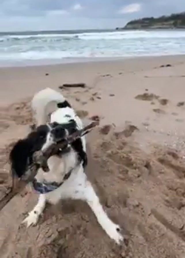 A black and white dog is on a beach. The dog is holding a large branch in its mouth. The dog runs with the branch, spinning in circles. The dog drops the branch in the sand. The beach is sandy with waves in the background. The sky is overcast.