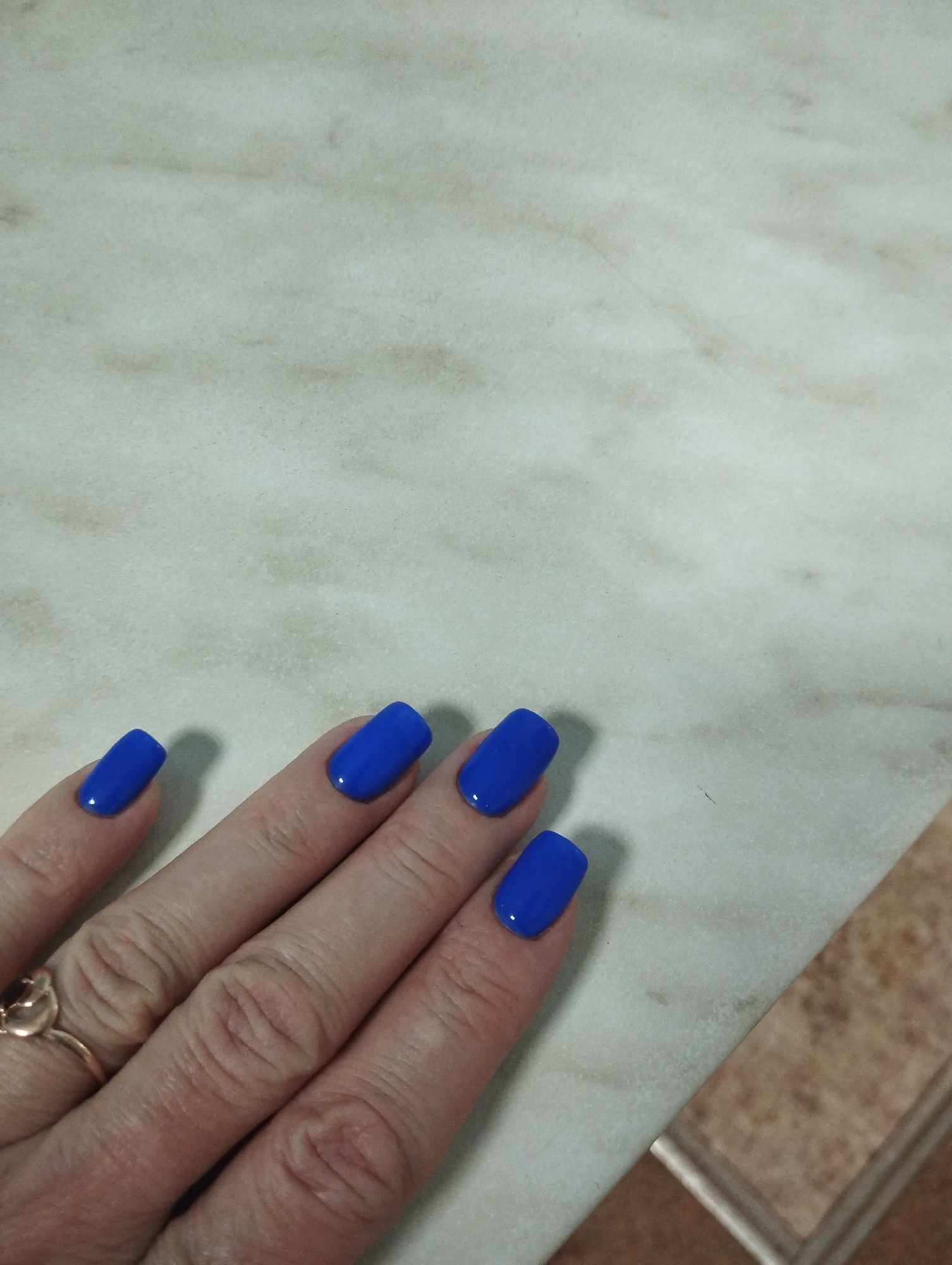 left hand with four fingers visible, each with a short, square-shaped nail painted a glossy, bright blue. A gold-colored ring is worn on the ring finger. The hand rests on a surface composed of two distinct areas: a large, light-colored surface resembling a marble or granite countertop and a smaller section of brown-patterned flooring. There is no information in the image to connect it to the city of Krasnogorskoye, Russia.