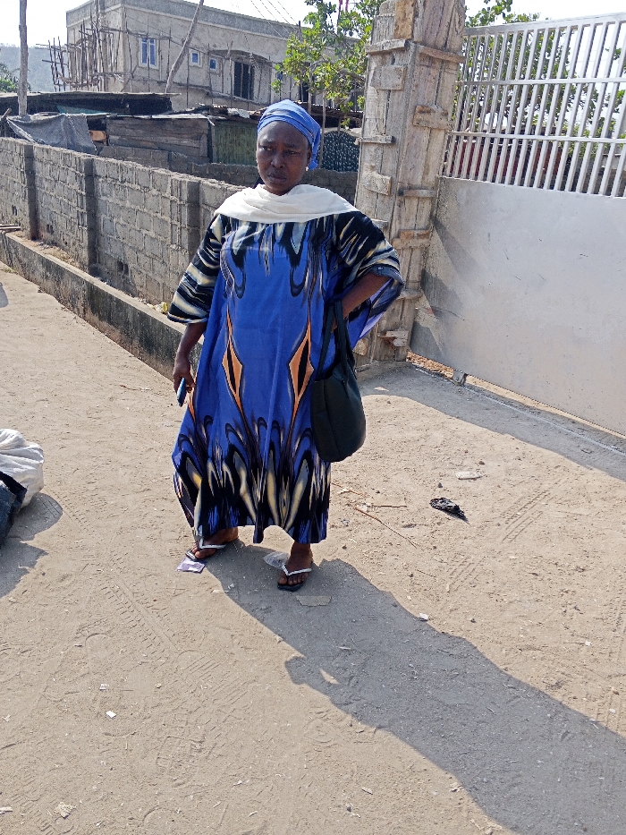 An adult female stands on an unpaved, dirt surface under clear skies in Zango-ndaji, Nigeria