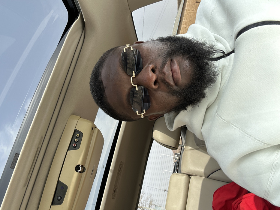 A man with dark skin and a beard, wearing sunglasses with gold accents, reclines in a car with a beige interior