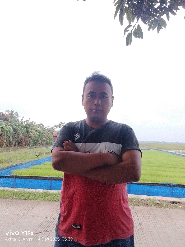 A man stands with crossed arms, wearing a dark gray, white-striped, and red t-shirt. Behind him, there's a field with rows of small green plants separated by blue netting. Lush green trees and banana plants fill the background. The sky is overcast. A smartphone's timestamp at the bottom of the image indicates "Vivo Y19s, Akhtar & Arvan, 14 Des 2025, 05:39".