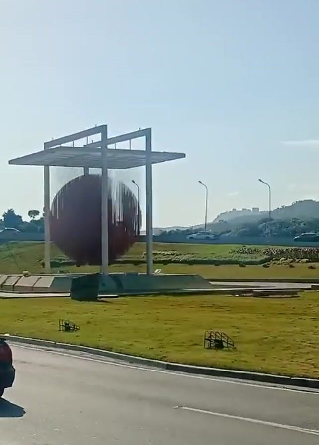 The video begins with an exterior shot from a moving vehicle showing a large, red spherical sculpture enclosed in a white rectangular frame, set on a grassy median