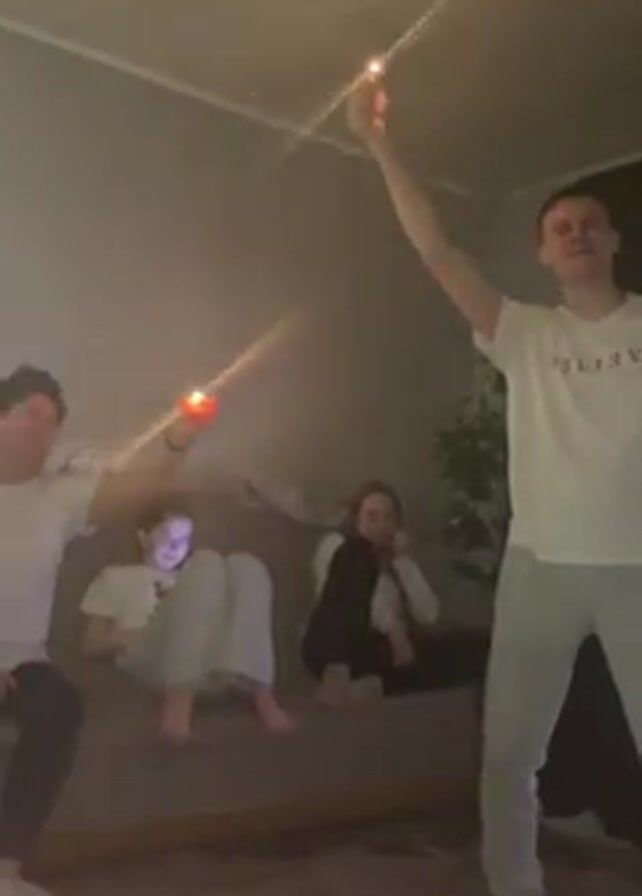 four people inside a room with low lighting. A person on the left is holding an illuminated object in their right hand, while a person is standing on the right side of the frame also holding an illuminated object with their right arm raised high. Two individuals are sitting on a couch between them, one looking at a screen, the other watching the illuminated objects. The room contains a couch, a decorated Christmas tree in the corner, and some personal belongings on top of the couch.
