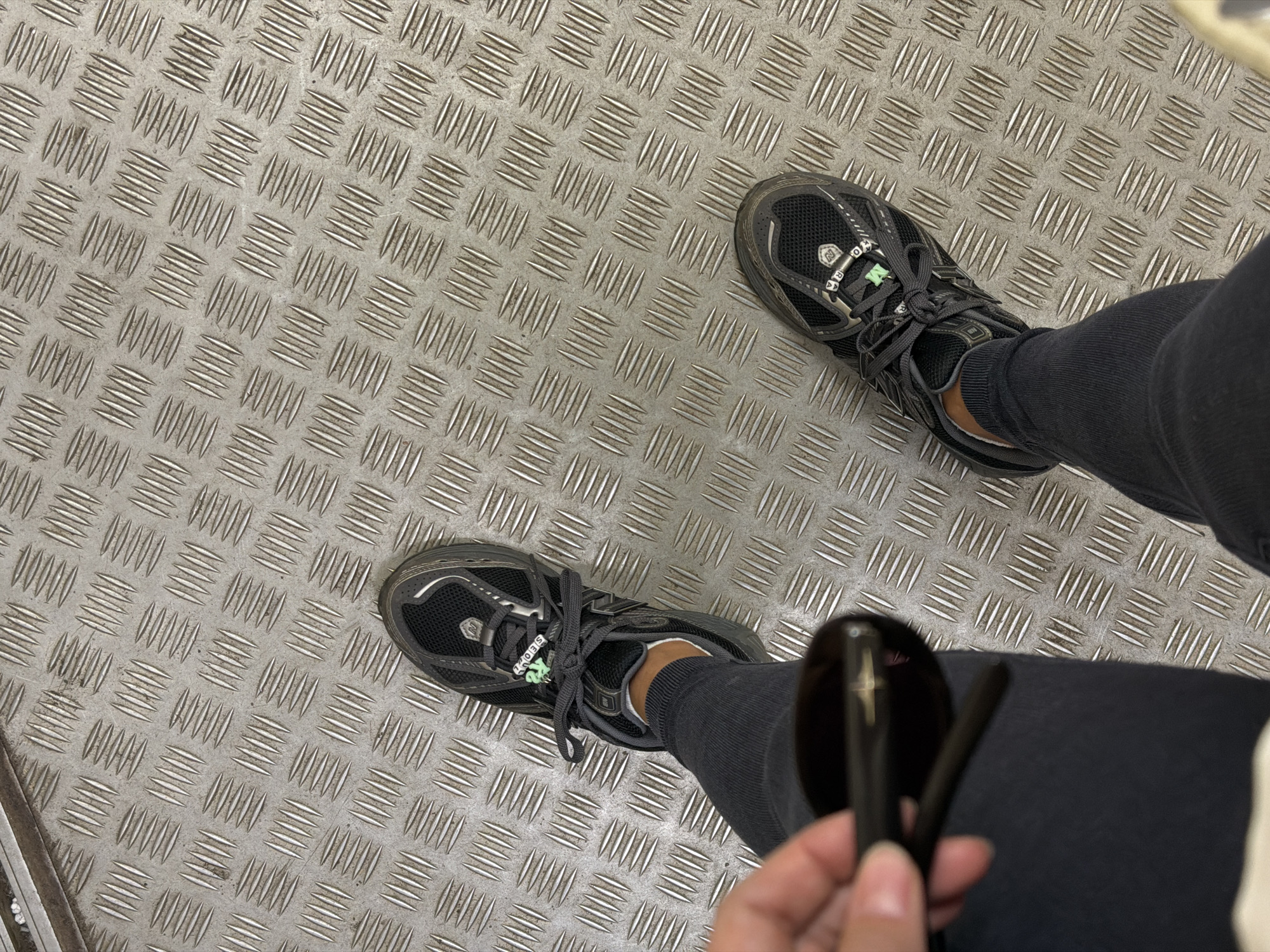first-person perspective of someone standing on a metal surface with a diamond-plate pattern. Two running shoes, grey in color, are visible. The person is wearing dark grey pants. In the foreground, a hand holds a pair of dark-colored sunglasses. The overall scene suggests an urban environment with industrial or utilitarian flooring. There is no visible indication of the location in Moscow, Russia.