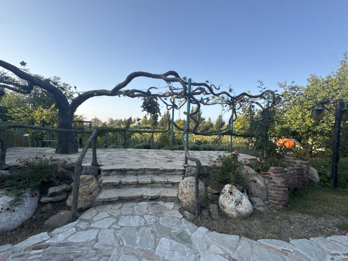 The image displays an outdoor scene in the city of Tsinandali, Georgia, under a clear blue sky. In the foreground, a path composed of irregularly shaped light grey flagstones leads to a three-step ascent constructed of identical material. Large, light-colored boulders flank the steps, interspersed with dry grass and low-lying green vegetation, including small red flowering plants and a single pink rose bloom visible on the right. A low, stacked reddish-brown brick wall is partially visible to the right of the steps. The steps culminate at a raised, flagstone-paved platform. Above this platform, a pergola structure features thick, gnarled dark brown branches, characteristic of grapevines, supported by thin blue metal posts. Green foliage and small clusters of grapes are suspended from this overhead canopy. A large, gnarled tree trunk on the far left is integrated into or acts as a support for the pergola. Beyond the platform, a dark horizontal railing delineates the edge of a vineyard, visible as rows of green plants extending across the mid-distance. The background consists of dense green trees beneath a cloudless blue sky. On the far right, partially obscured by foliage, are several large, bright orange spherical objects. A wooden post near the right edge of the frame supports a decorative wooden structure resembling a birdhouse or lantern. No individuals are present in the scene.