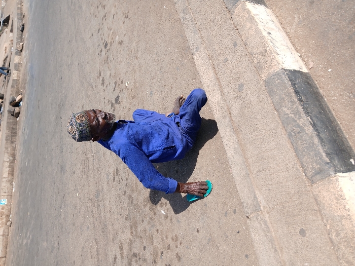 The image captures an elderly male subject in an outdoor urban environment within Jos, Nigeria. The man, appearing to be of African descent, is observed in a crouched or seated position directly on a dusty, light grey asphalt road. He wears a faded blue long-sleeved shirt, blue trousers, and a patterned skullcap. His left hand rests upon a single green flip-flop, which appears to provide support on the road surface. His left lower leg is not visible, while his right leg is bent at the knee. The man possesses a grey beard and a weathered facial appearance, with his gaze directed slightly upwards and to the right. A concrete curb, painted with alternating black and white sections, runs horizontally across the lower part of the frame, separating the road from an unseen shoulder. In the background, a raised dirt embankment with scattered debris is visible across the road, and the lower legs of another individual are partially seen in the distance. The scene is illuminated by bright sunlight, casting distinct shadows from the man and other elements.