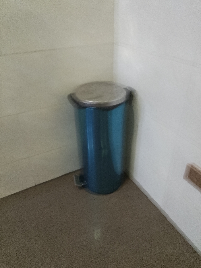 - "A blue metal trash can with a silver lid is situated in the corner of a room" by FM-aUq7B2, licensed under CC BY 4.0