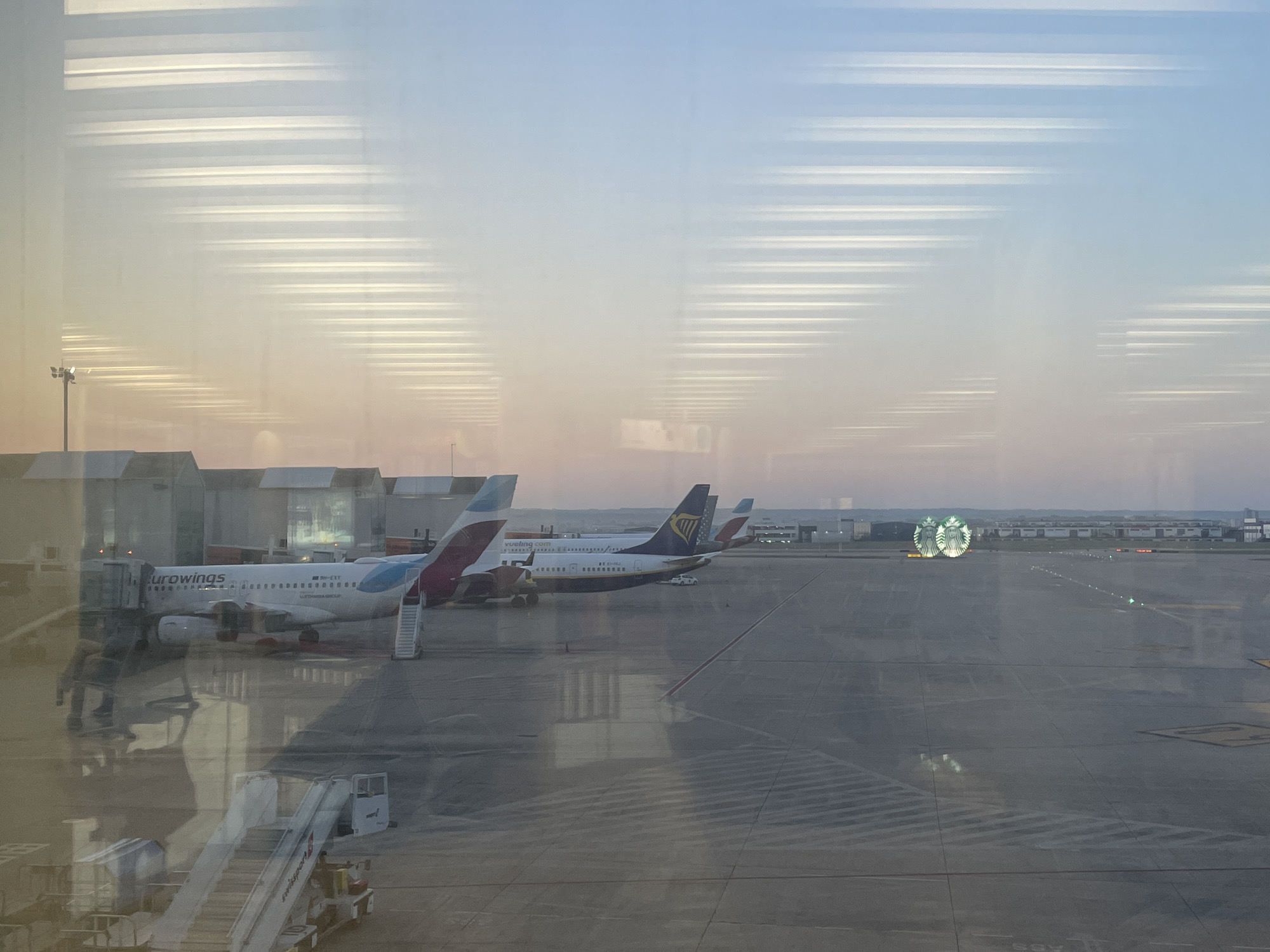 The image depicts an airport tarmac scene at Palma de Mallorca Airport (PMI) in Son Santjoan, Spain, viewed through a reflective window during twilight. The sky transitions from light blue overhead to a pale orange near the horizon, with prominent horizontal light streaks and general haze from internal window reflections superimposed across the entire frame. In the mid-ground, a white Eurowings Airbus A320 series aircraft, registration D-AEGY, is parked at a gate, connected to a gray jet bridge. Reflections of two indistinct human figures are visible on the window surface in the lower-left quadrant, below the Eurowings aircraft. A mobile passenger stair, partially visible, is also reflected in the foreground. Behind the Eurowings aircraft, a blue and white Ryanair Boeing 737, registration EI-DLJ, is parked. Further to the right and behind the Ryanair aircraft, a white Vueling aircraft with "vueling.com" visible on its fuselage is also positioned. The tarmac is a large expanse of gray concrete or asphalt, marked with yellow lines. Terminal buildings or hangars with light-colored roofs are visible behind the parked aircraft. A tall floodlight pole with multiple lamps stands on the far left. Distant green runway or taxiway lights are discernible extending into the distance on the right side of the tarmac. A clear reflection of two green Starbucks siren logos is superimposed on the window, appearing directly over the distant tarmac area.