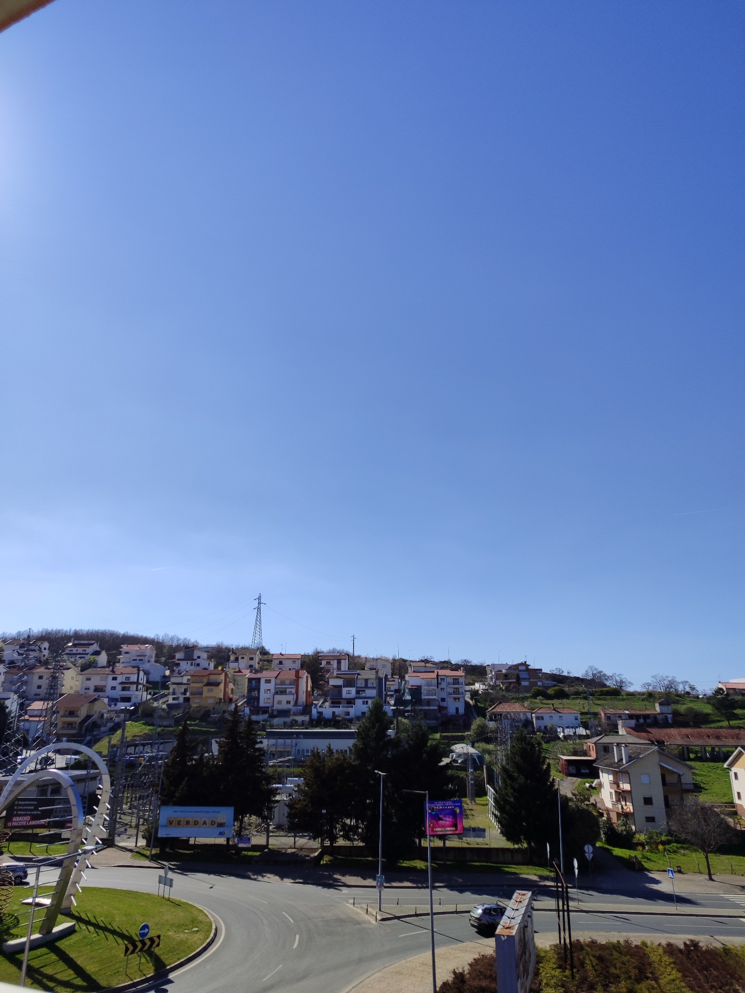 The image presents an elevated, panoramic view of a hilly urban-suburban environment under a clear, bright blue sky. A distinct sun flare is visible in the upper left corner, with a faint white contrail present in the upper right. In the foreground, a multi-lane asphalt road curves from the left towards the right, forming a roundabout or complex intersection. A central grassy median within the road features a large, modern metallic sculpture composed of multiple curved, open-frame elements. Road markings, including white lines and a blue directional arrow sign indicating a right turn, are visible on the asphalt and central island. Several utility poles and streetlights line the road. Two prominent billboards are present: a rectangular billboard on the right displays the word "VERDAD," and a vertical banner further right features vibrant pink and purple colors, with the text "NIGHT CLUB" partially legible. A light-colored sedan is parked on the right side of the road, facing away from the viewer, while another dark vehicle is partially obscured behind the metallic sculpture. No individuals are discernible. The background is characterized by densely packed residential buildings constructed on undulating green hills. These structures are primarily two to three stories high, exhibiting various architectural styles with diverse facade colors and pitched, tiled roofs. A tall metal electricity transmission tower stands prominently on the main hill, slightly left of center. Scattered patches of trees, including dark green conifers and leafless deciduous trees, populate the hillsides and intersperse among the buildings. The location is an unnamed city within an unnamed country.