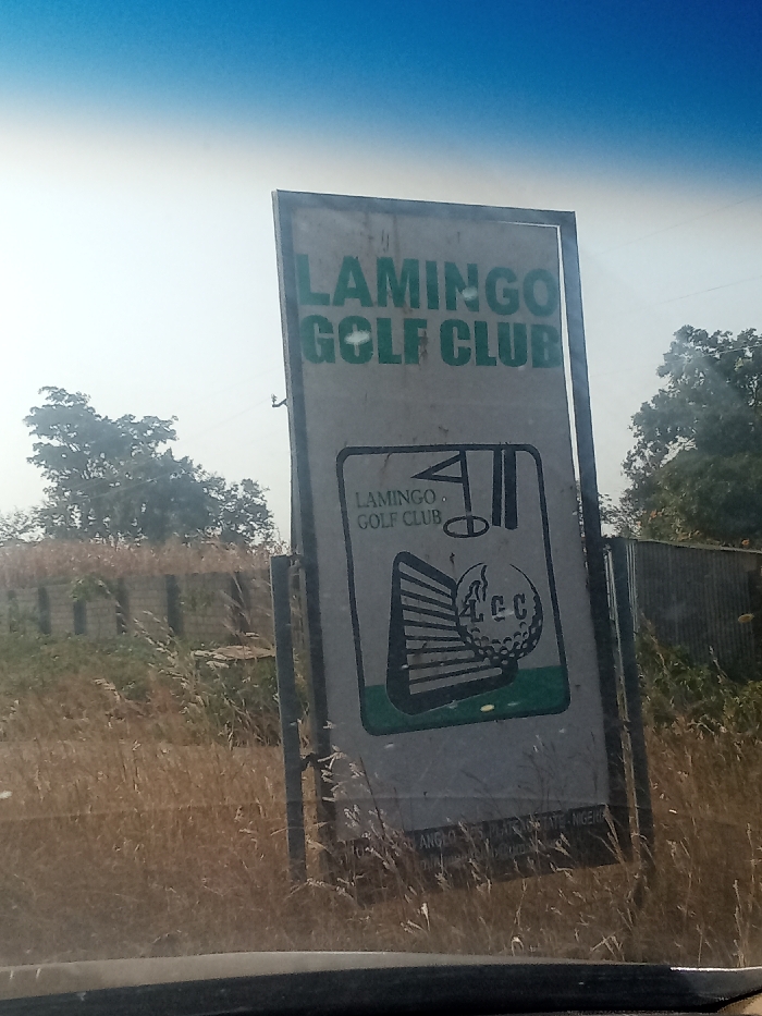 The image depicts a weathered, rectangular sign for the "LAMINGO GOLF CLUB" erected amidst dry vegetation. The sign prominently features "LAMINGO GOLF CLUB" in green capital letters at its top. Below this, a graphic illustrates a golf flag in a hole, a golf club, and a golf ball marked with "LCC". Partially visible text at the bottom of the sign indicates the location as "ANGLO-JOS, PLATEAU STATE, NIGERIA". The sign itself exhibits fading and surface imperfections. The foreground consists of dry, light-brown grass and weeds, with a dark, indistinct surface (likely a vehicle dashboard) at the very bottom. Behind the sign, to the left, a low concrete block wall is partially visible, obscured by similar dry vegetation. Several trees with green foliage are present in the background on both sides. The sky dominates the upper portion, transitioning from a deep blue at the top to a bright, hazy, pale blue towards the horizon. No individuals are visible, and no specific actions or interactions are depicted. The scene suggests a semi-rural or undeveloped area, with dry conditions indicated by the vegetation. The requested location of Nabatum, Nigeria, is not explicitly stated on the sign, which instead specifies Anglo-Jos, Plateau State.