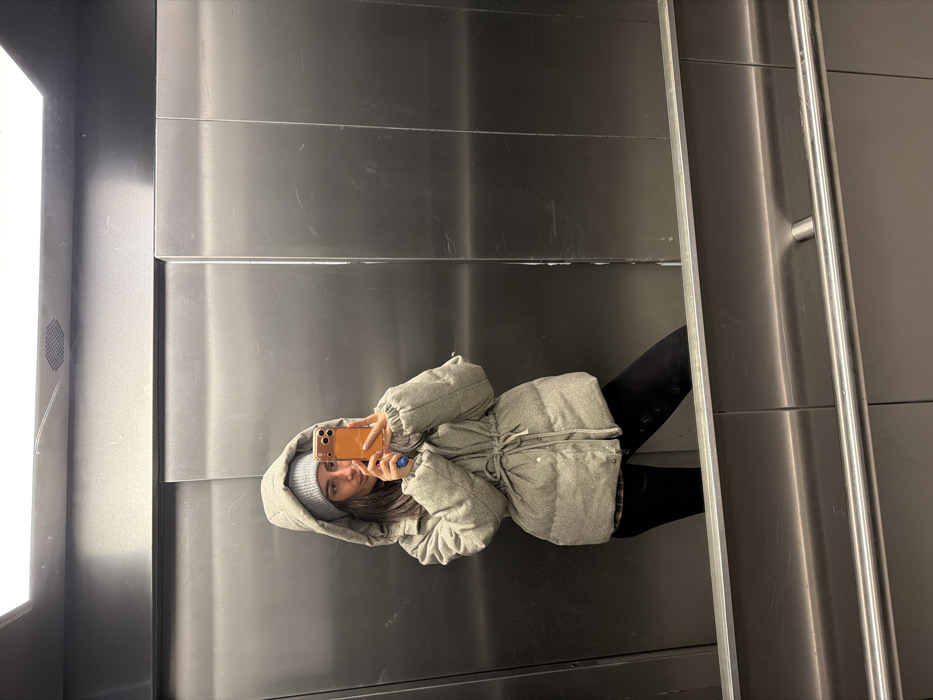 This image captures a scene within an elevator located in Kommunarka, Russia. A young adult female, positioned slightly left of center, is reflected in the elevator's polished interior surface. She is wearing a light grey hooded puffer jacket, cinched at the waist with a drawstring, and a light grey knit beanie. Dark trousers or leggings are visible below the jacket, with a dark plaid shirt peeking out beneath the jacket's hem. The subject holds a smartphone with an orange-brown colored case in her extended right hand, actively taking a mirror selfie. Her face is partially obscured by the phone, with her left eye, nose, and mouth visible, displaying a neutral expression. The elevator environment consists of brushed stainless steel panels, exhibiting minor scuffs and scratches. A rectangular overhead light fixture illuminates the space from the ceiling. A horizontal polished metal handrail is visible in the lower foreground.