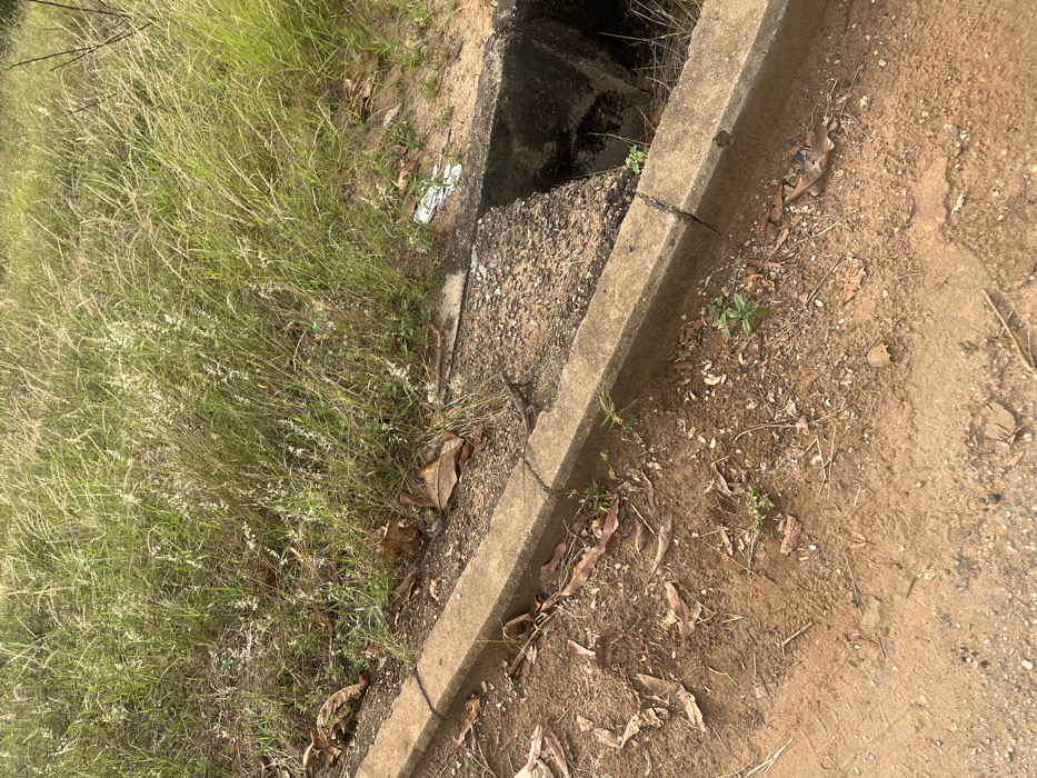 This image captures an outdoor scene in Ijanikin, Nigeria, from a low perspective. The foreground consists of reddish-brown soil sparsely covered with small green plants and numerous scattered dry, brown leaves. A grey concrete curb runs horizontally across the mid-ground, showing minor cracks and dirt accumulation. Immediately behind the curb, a narrow strip of dark soil with scattered debris transitions into an area of tall, light green grass interspersed with white-plumed weeds, which fills the upper portion of the frame. A dark-colored lizard, approximately 10-15 centimeters in length, is positioned on the ground directly behind the concrete curb, near the edge of the tall grass. To the right, the concrete curb terminates, revealing an open concrete drainage channel or culvert with dark, possibly damp, interior surfaces. A crumpled white object lies on the ground adjacent to the opening of this drain. No human subjects or direct interactions are visible. The environment presents as a partially unmaintained area, likely adjacent to a path or unpaved road.